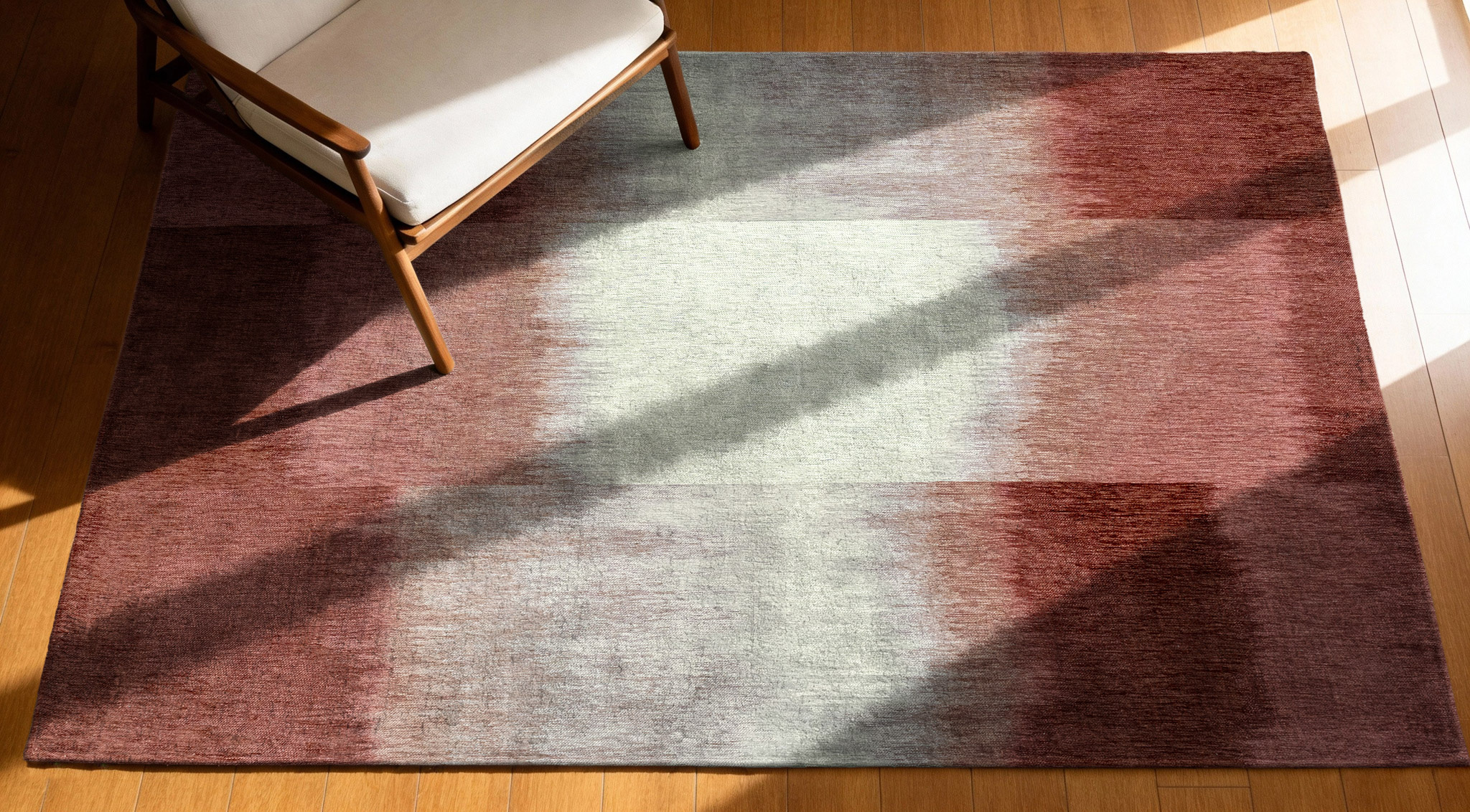 "SENDAI finds its inspiration in traditional Indian fabric techniques, where colors melt into one another to create gradients of great delicacy. These tie-dye effects, imprinted with artisanal gestures, have been reinterpreted here with a contemporary gaze. Rather than faithfully reproducing these motifs, the design strives to capture their essence: the fluid transition of hues, the sensation of movement, the poetry of color passages. In SENDAI, every nuance is placed with care to create a composition that is both mastered and open, offering a subtle balance between spontaneity and structure. The gradients, worked in large flat tints, give the rug a modern character without ever breaking with the softness of its original inspiration. The sobriety of the motif, combined with this exploration of color, confers a discreet elegance upon SENDAI. The result is a rug that integrates naturally into contemporary interiors: streamlined enough to let the space breathe, yet bearing a visual identity that brings depth and warmth. SENDAI invites an attentive look, a quiet contemplation, like a landscape revealing itself in successive nuances."